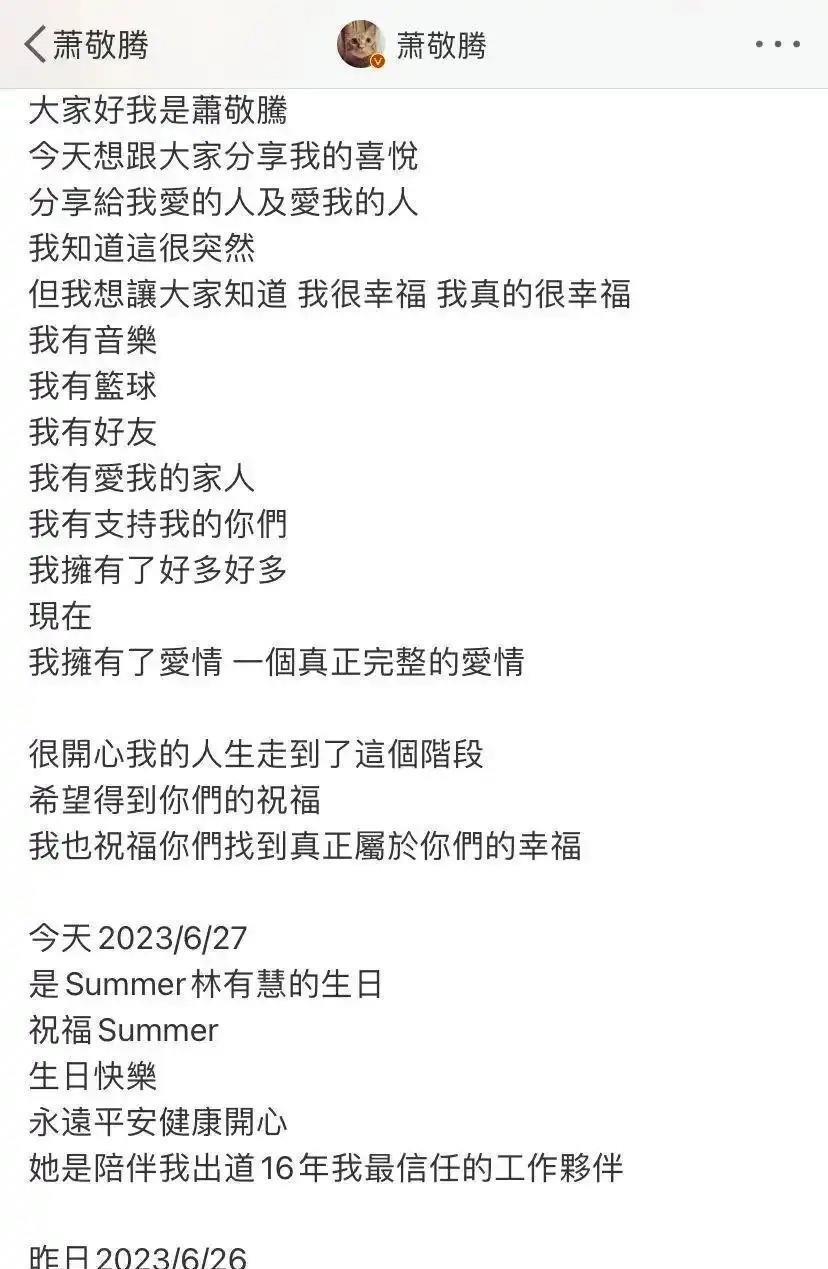 一直到2023年6月,这段持续了十几年的恋情传闻终于有了个说法。萧敬腾自己正式宣布了恋情,还晒出了和林有慧的合照,两人脸上都笑得挺灿烂。我挺高兴自己的人生到了这个阶段,也期待你们能送上祝福。